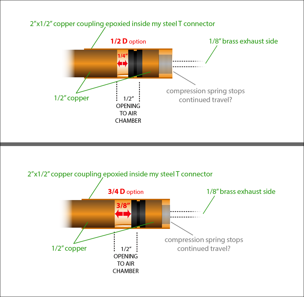 Are the spaces the piston needs to travel back in these 1/2 ID and 3/4 ID versions of my setup correct? And which is the better choice?