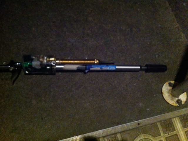 It is about 180*14mm brass tube 15mm piston with 10mm travel and a 6mm barrel it uses a shrader valve to connect the bicycle pump and a blow gun as the release valve all the joins for the blow gun and pump connections have had casting resin moulded around them to prevent possible leaks from any hoses or joins.another pic that maybe a bit clearer but it won't get much better than that.thanks for any help you may be able to give.