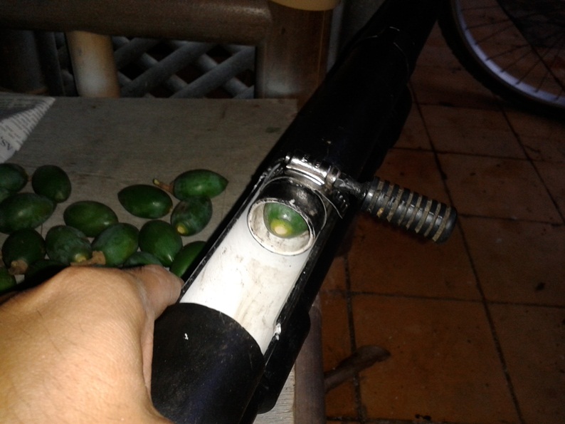 haha, i see you use those fruits as ammo, i used some local forest fruits and olives kernel . i was able to penetrate both sides of a big metal olive canoneocim wrote:Hi guys, this is my new gun, scaling up from my previous gun. It is 3/4 inch piston inside 1 inch brass T with 1/2 inch seat. The barrel is 1 inch, used max with 80 psi. Multi shoot (attached to commercial air compressor), chamber filling, hammer valve for piloting, breech loading.