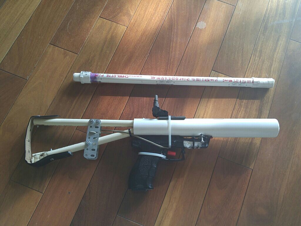 Progress has been made. I finished the cannon this afternoon. Its ready for its first shots. I have an 18 inch barrel of 1/2 inch PVC and a 6 inch 3/4 inner dia. combustion chamber sparked by Char-broil brand BBQ igniter. All of this concealed in a 1 1/4 inch PVC upper receiver and a lower receiver taken from broken Walmart H&K P30 Airsoft pistol. The barrel is threaded onto the chamber because with the stock in place there is no way to access the combustion chamber.