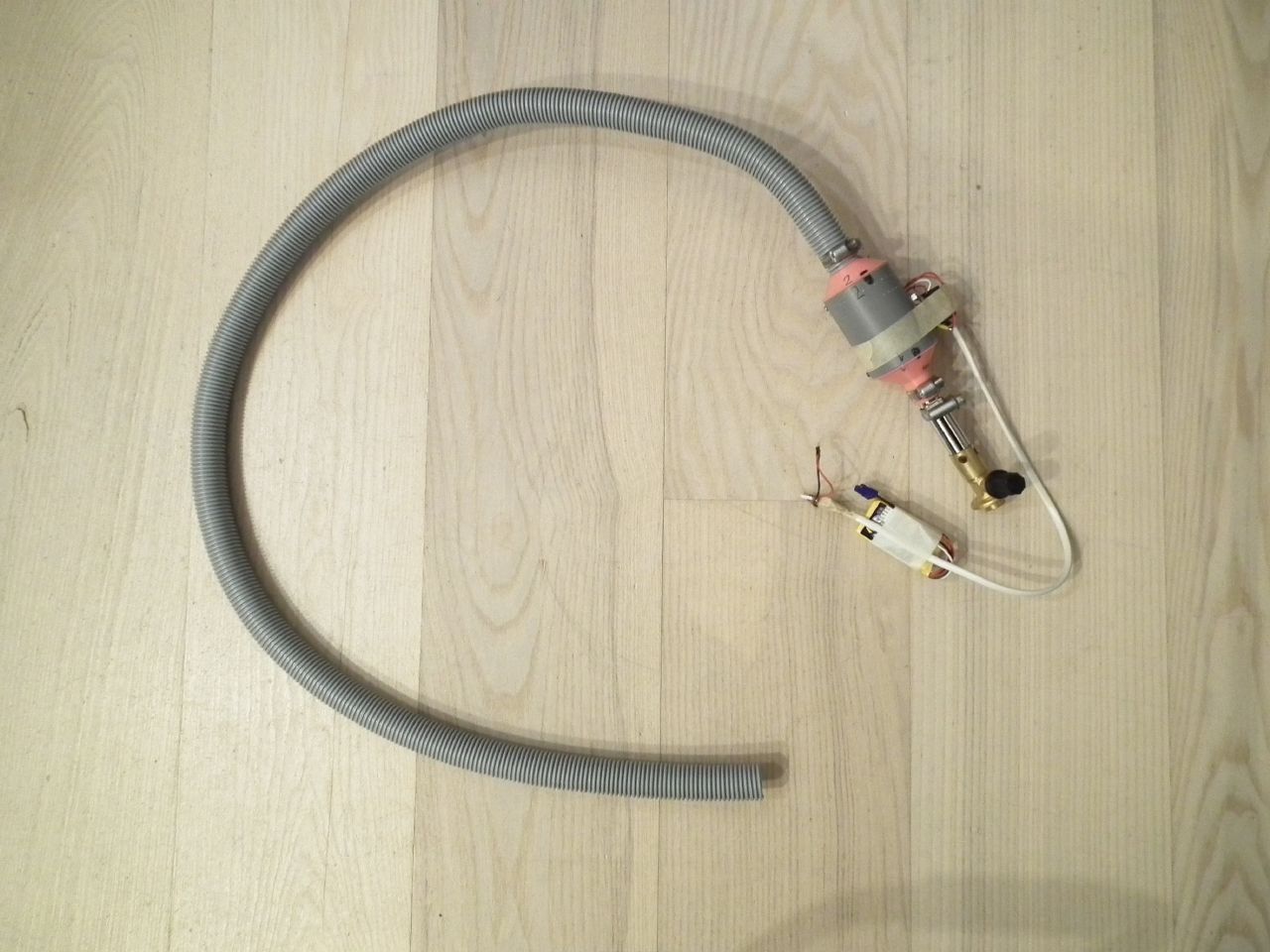 During my testing of gas burners, I wanted to try out a weed burner. So I bought one on sale and cut away the long and bent part of the tube so it would fit my initiator chamber. I was surprised how well it worked! And it's dead simple, more simple than the Express burner. So I hooked up one of my HV modules to my new homemade spark plug and mounted the spark plug in the middle of the initiator tube. The HV module is powered by a small LiPo cell with a switch for ignition. The long main tube is 120cm.