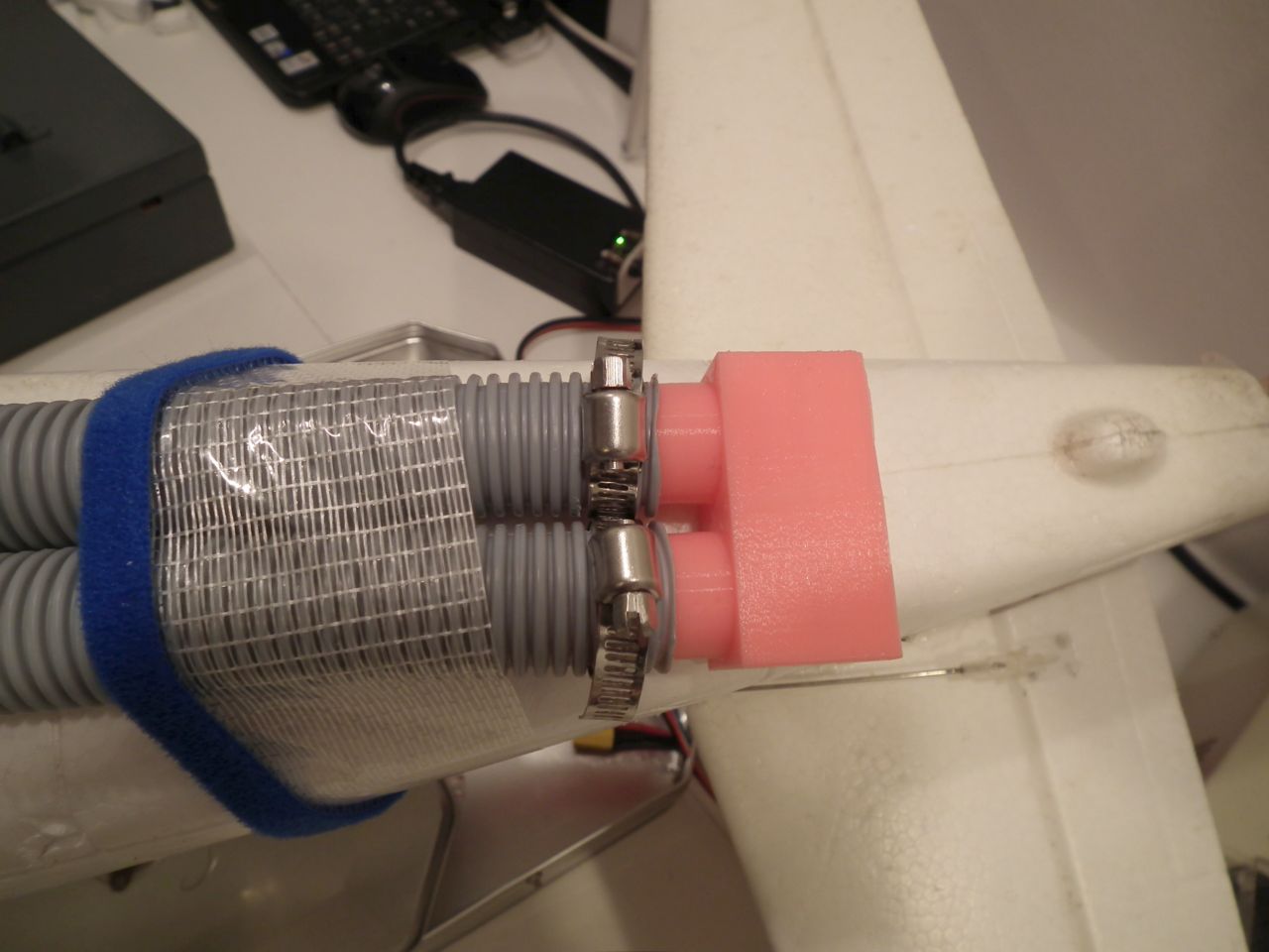 The 150ml propane tank should be mounted as upright as possible to avoid liquid propane entering the blue hose. But the plane was not big enough for a full upright, and I wanted to be able to fit the canopy afterwards so it does sit at an angle. I modified the valve from the weed burner to accept the blue hose, which is actually a gasoline hose from gasoline RC cars, but it seems to work fine. Also I attached an arm for servo actuation so I could open and close the gas flow by remote. The 1 meter long detonation tube was cut in two and the square pink box in the pictures was 3D printed and used for connecting the tubes so they could better fit on the small plane. The propane nozzle, nozzle housing and mixer tube was real heavy, so I 3D printed those parts too, except the actual propane nozzle. Since I want the detonation tube opening to point forward on the plane, I made an adapter for the air intake, so that the exhaust hole and intake hole gets the same amount of air pressure from the air passing by due to the plane moving forward. This way, the propane nozzle can actually enable flow from intake to exhaust using the venturi effect, but the air pressure inside the initiator chamber and detonation tube will be slightly larger than atmospheric pressure.
