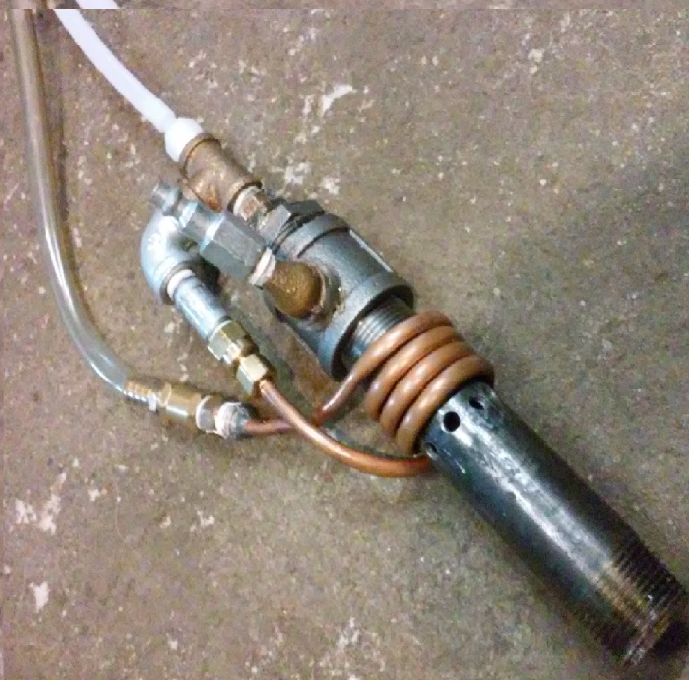 The polyethylene tubing is the air line, the vinyl is for the oil input, and the male quick connect was supposed to be for a propane inlet to warm up/start the burner on but I've kind of ditched it, now I just start a small wood fire under the burner to get it going. The copper winding around the base are for preheating the oil (not sure how well it actually works though). The holes were meant to provide more oxygen to the propane nozzle through a slight abusing of the venturi effect but they work pretty well at supplying extra air to the oil stream too.