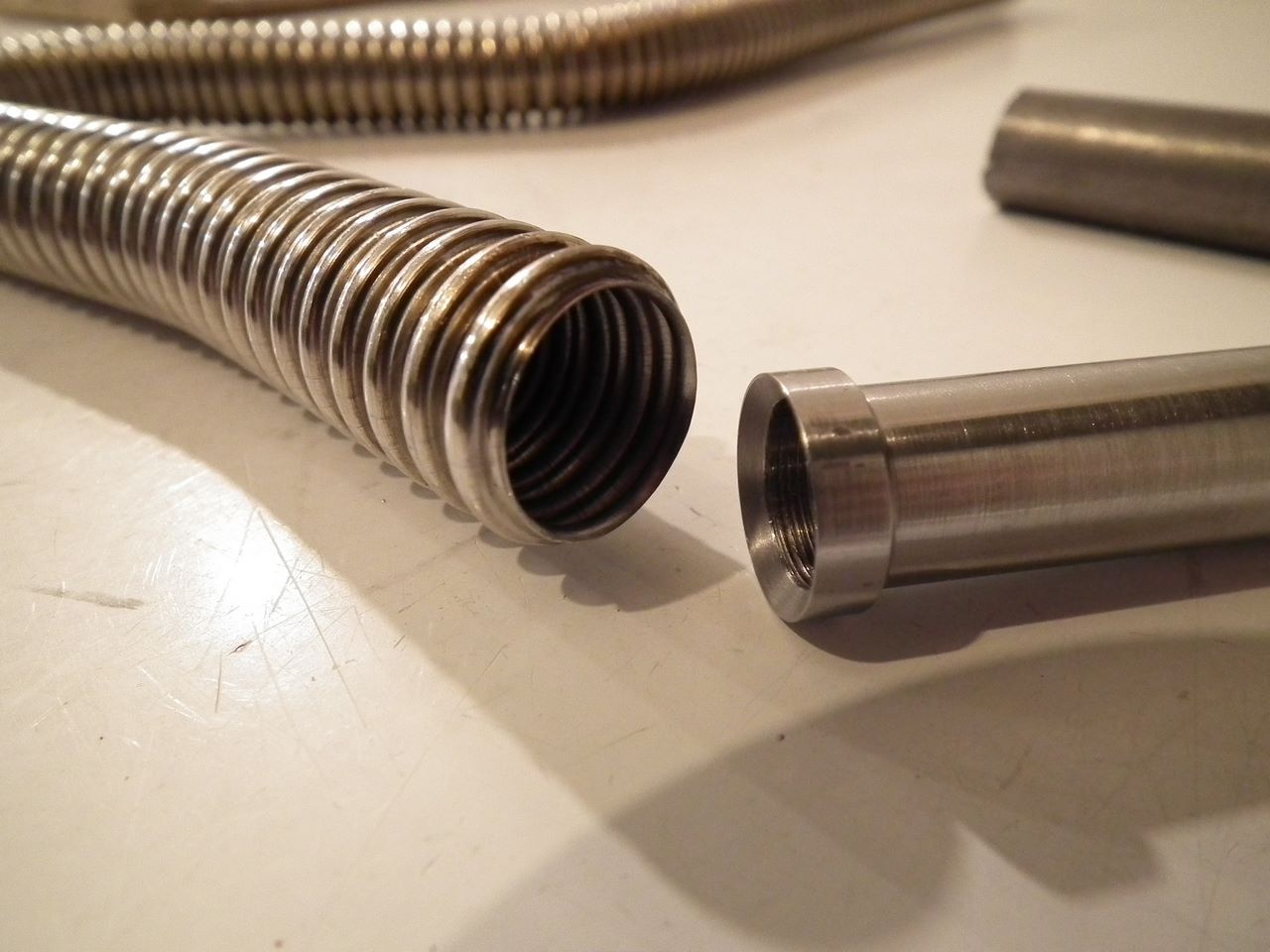 But I do have some update though. I have long been thinking of the best way to attach the aluminium air/gas mixer to the corrugated mixer tube, and had a few ideas but now I tried one out. The test mixer is turned down from 15mm to 12mm. A M12x1.0 external thread is made on the mixer end, and a normal M10 nut was made into a steel adapter with tapped M12x1.0 internal thread. The adapter is silver soldered to the corrugated mixer tube. This seems to work just perfectly, it takes up almost no space, is lightweight and can easily be disassembled during mounting. The mixer is just a test, the final mixer will be optimized in size/weight when I know the final dimensions.