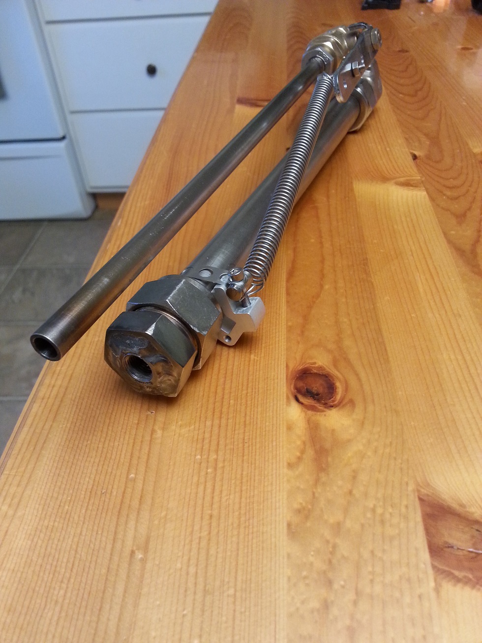 1/4" threaded ball valve with 1/4" ID barrel and 3/4" stainless tubeing for the chamber. I drilled a hole in the side of the valve as a loading point, then realised that some air would leak out as the ball rotates, was thinking the BB might shoot out the top instead of down the barrel, but it actually works. Put a spring on it and 100psi for some test shots, it was pretty impressive :D Locking and release mechanism will be the fun bit :idea: