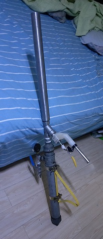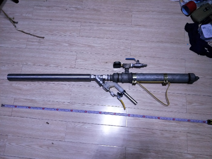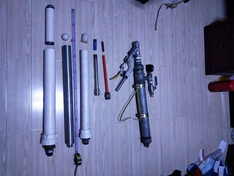 Main body is made of 2' steel tube ,and I added a stock to hold the recoil.Refill set include a 3kg/6.5lbs CO2 fire extingusher which holds the CO2 ,enough for about 75 shots at 175 psi.