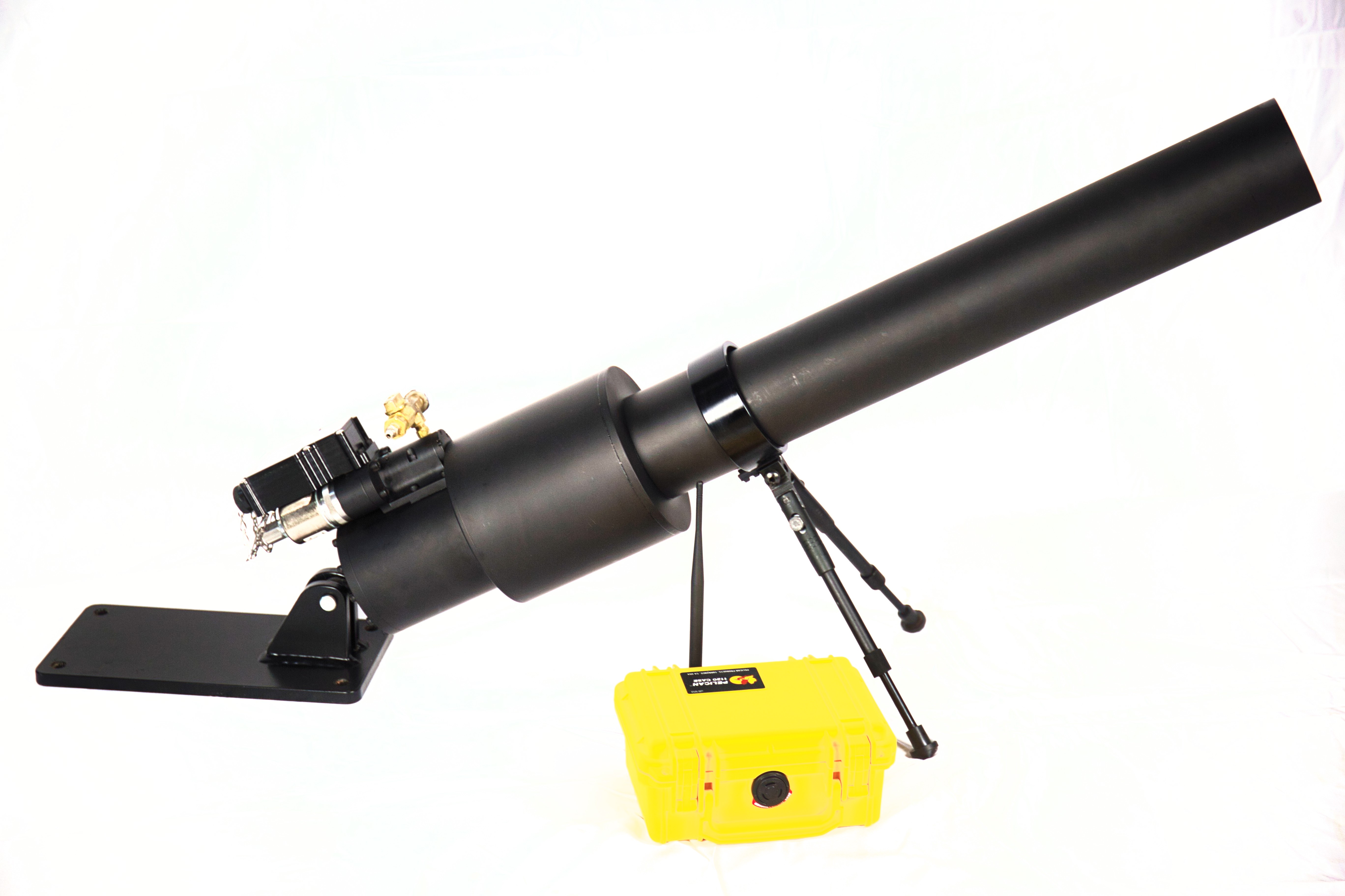 Eclipse 80mm with remote control (wired or encrypted RF) for synchronous firing for net launch system. Four launchers launch 8lb. rounds to deploy 60'x40' net. Scaled up version of Eclipse piston valve 1200psi max.