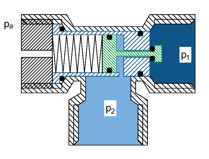 The displacement of the piston is only subject to the force of the spring, which is adjusted with the screw on the right of the drawing, and the force of the air produced on the left side, (arrow in soft blue).