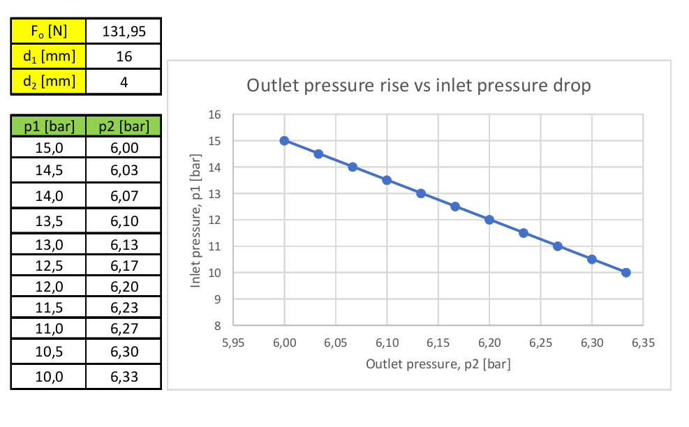 When I keep the spring force constant at Fo=31,1N and solve for pressure p2 while lowering inlet pressure p1, the math falls apart below p1=11bar. The results become nonsensical in that the outlet pressure p2 becomes greater than p1. I'm not sure if this is due to some error I made or the assumption of constant spring force is no longer valid when the spring elongates, opens the regulator and stops it from functioning.