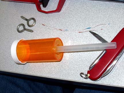 A friend of mine recently turned me on to the whole spud gun thing. After seeing everyone else's creations I have been itching to build my own. I don't have a ton of hardware lying around, and I wanted to get something going now, so I decided a mini pill bottle cannon would be a good shooter to start with. I put this thing together in less than an hour (had to wait for the epoxy to dry). I based it on PCGUY's pill shooter with my own modifications. I used a clear 2" pill bottle, a clear pen cylinder, two of those little hook screws used for hanging things, and a clicker and wires out of one of those long click lighters. It's very basic, but quick and very easy to make.