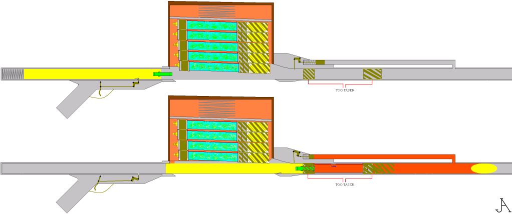 Well Bluetooth, the reason I used I spring loaded magazine is so there is no miss feeding, and the electricity is continuously applied to the to ring in the bolt (the yellow green boxes in the barrel with the lines through it) when the trigger is pulled the bolt closes pushing a round in to the chamber were the two sets of rings line up completing the circuit from the tazer to the spark gaps fire the whole thing. It’s all explained in my first post.