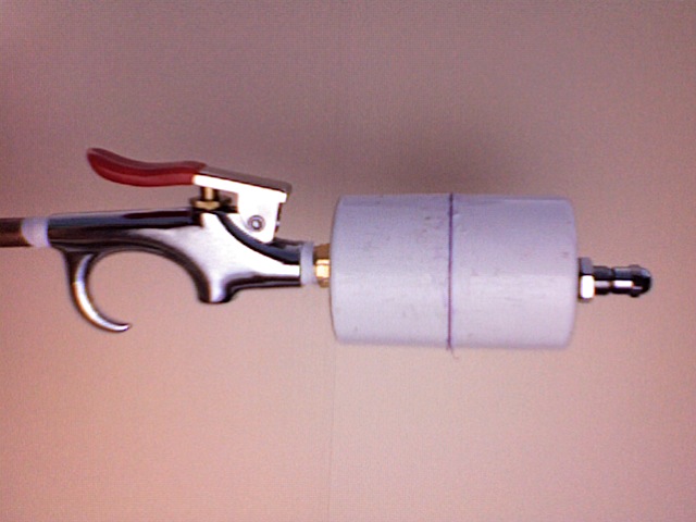 This is my mini pneumatic. It uses a blowgun as a valve with 1/8" brass pipe as the barrel. The chamber is 1 1/4 inch with two endcaps making up the entire length, I just cut enough pipe to join the two. I built this because my dad claims that my butane mini is a fire hazard.