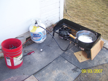 3. Set it up: see pics. You need a heat source and somehing to hold the lead in while the heat is applied. You need somewhere to put the lead after is has liquified, like a mold.