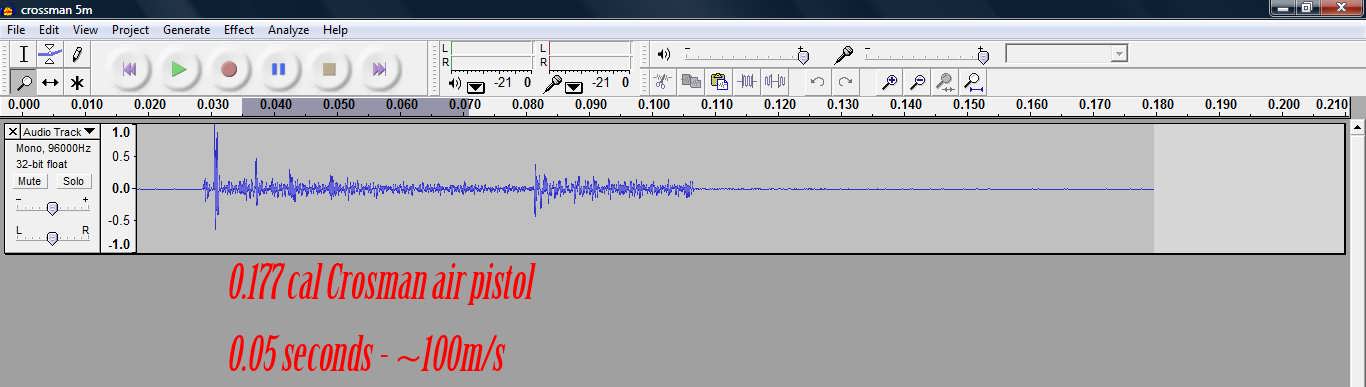 Measuring from the start of the first peak to start of the second peak gives me a time of 0.0032 seconds, the distance between the phototransistors is 28cm or 11". 0.28m/0.0032 = 87.5 meters per second or 287 feet per second.