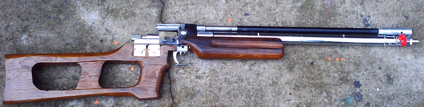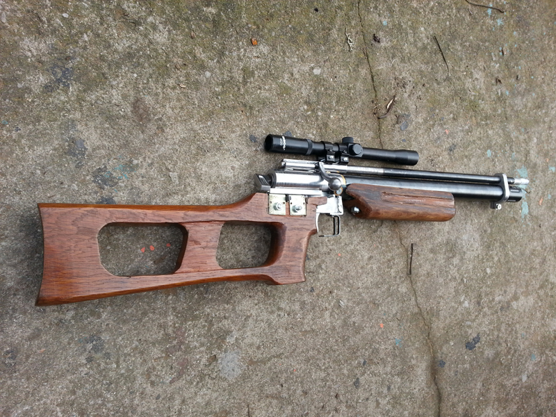 Hello again, its time for the third upgrade of my rifle. Now it has 200 bar air tank, new trigger and everything is fixed with screws - no more resin or soldering. Its much more powerful now , but also very loud. It weights 3 kg , 80 cm. long. The air tank is from hatsan at44 180cubic centimeters. I wanted the trigger to be in front of the sear so i used http://www.enfield-rifles.com/uploads/2 ... rigger.jpg this.