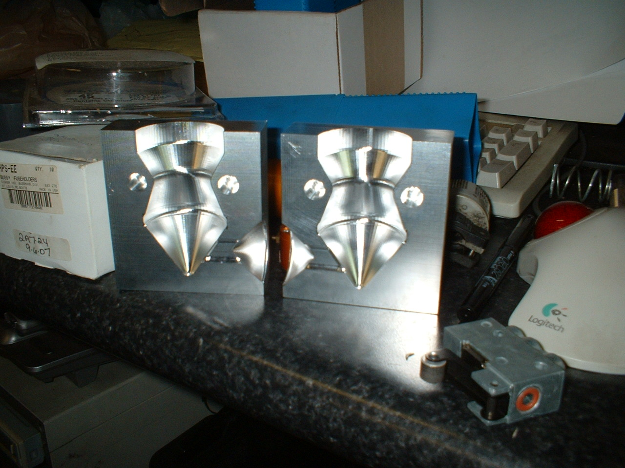 JSR, We make lots of fishing weight, candle and chocolate molds too. To keep the cost of the molds down we make them from the smallest blocks we can. We simply advise our clients to tilt the mold till no bubbles appear in the castings. The parting line is kept a little rough too, it is not air tight. Air will escape easily but lead will only produce a tiny flash line. I made the other side a few hours ago, I will make the core on the lathe later. Oh, I placed the sprue on the side so the tip would be unblemished. There is a slight undercut in the sprue right where it meets the body so it will break off fairly clean. Just touch up with a utility knife.