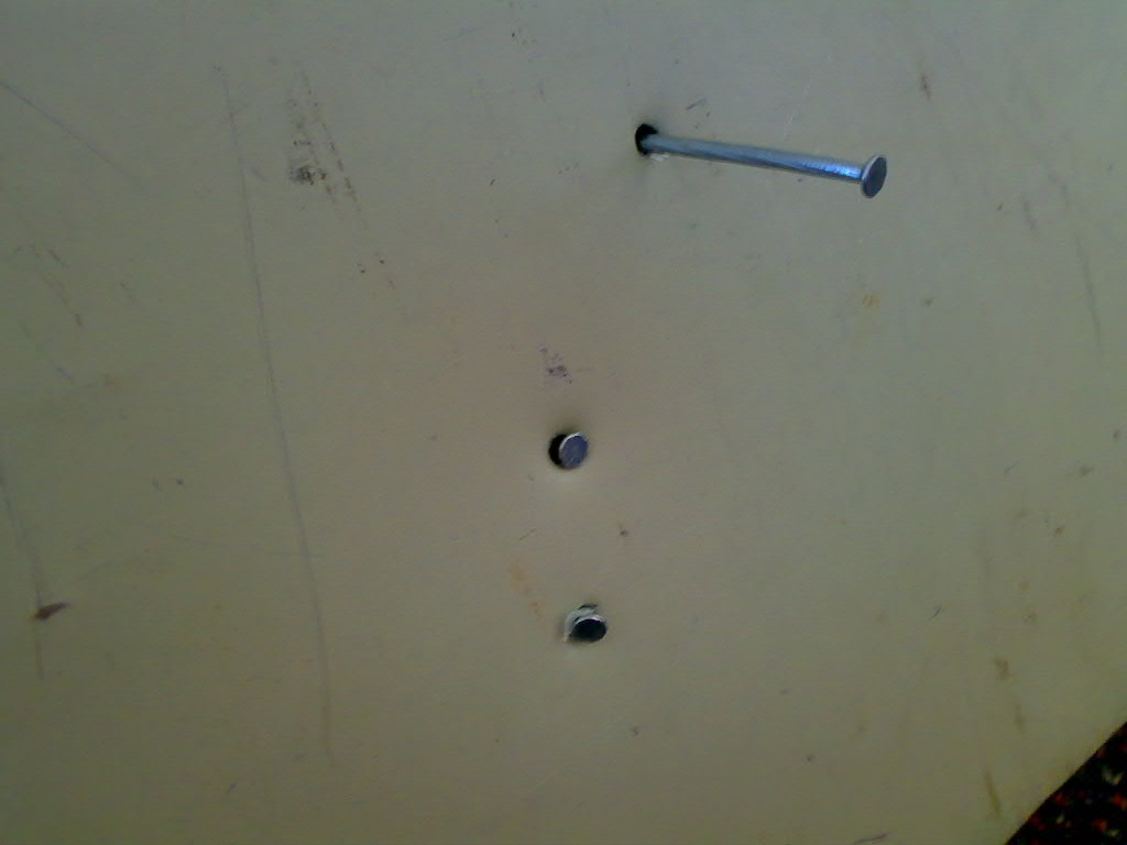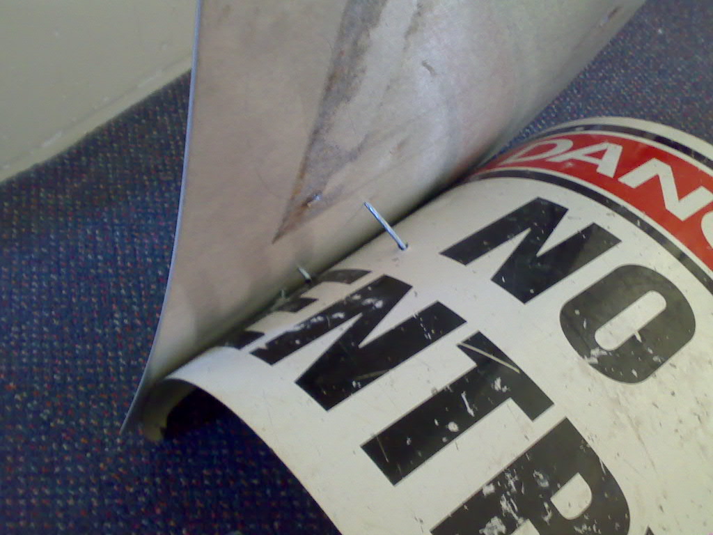 The second set of pictures are a couple i fired this morning into two aluminium signs i "found" around the neighbourhood. They all went through totally, only stopped by the head of the nail. The plastic stabilisers were sheared off by the force of the nail embedding itself. The nail sticking out was the first i fired, its only like that because at first the two signs were some distance apart, with the smaller one at the back, but i changed the config after that one.