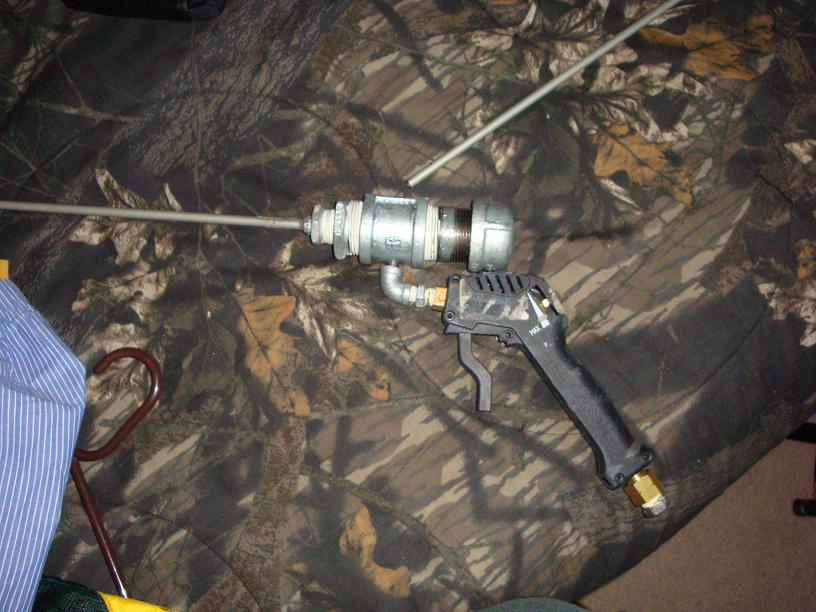 I've decided to give it another shot in a simpler design. It still uses a sawed down 90 degree tee, just inside 1 1/4" pipe. I'm waiting for the JB Weld on the barrel to dry, then I just have to attach the pressure washer handle and test it! Barrel is 12" brass tubing sleeved in brakeline
