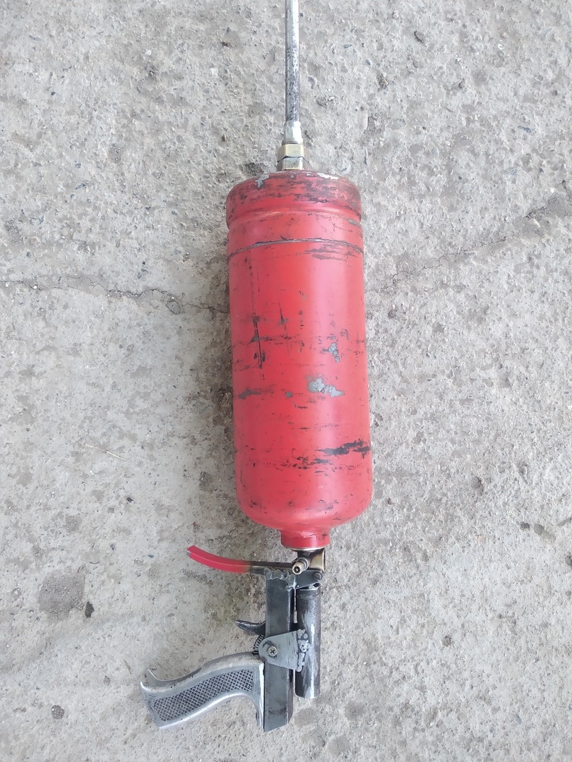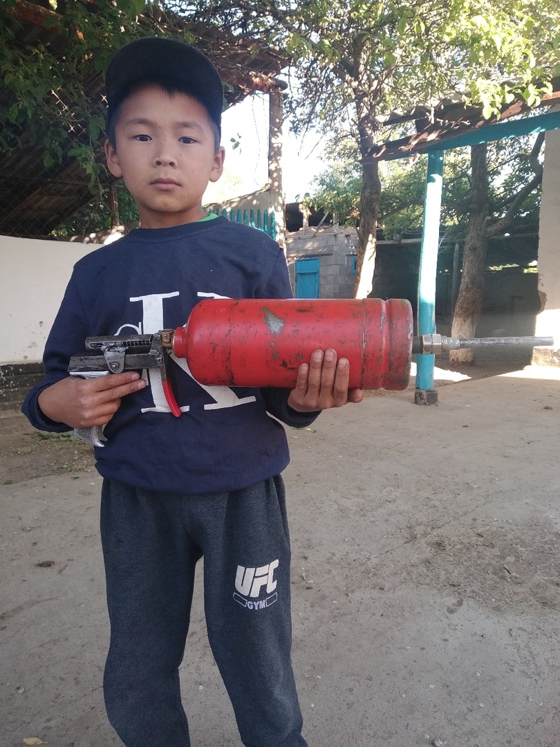 My friend made another gun. It is made of a fire extinguisher, the valve is balanced. He made her keak toy for his younger brother.