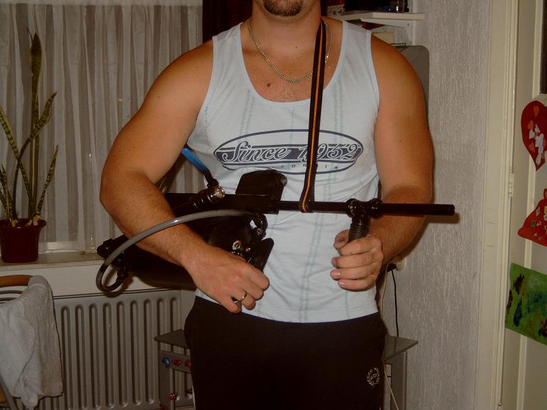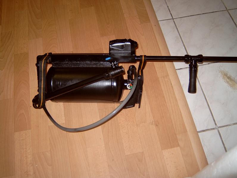 very nice design. i really like how you used a fire extinguisher valve as your trigger. thats something very few people do. im tempted to use a fire extinguisher on a friend of mine to use up the CO2 just to get to the valve, as well as the metal tank as a resevoir. what is your estimated range with this puppy? and also do you have any idea as to the speed of the marbels when they fly out of the barrel?